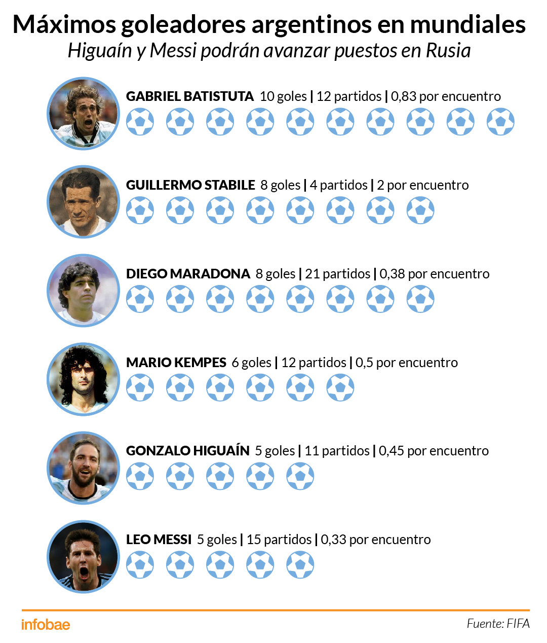 Leo Messi es uno de los jugadores que tiene más participaciones en copas del mundo, un dato importante es que casi el 80% de jugadores de la selección juegan en ligas europeas. Estos son sus maximos goleadores: